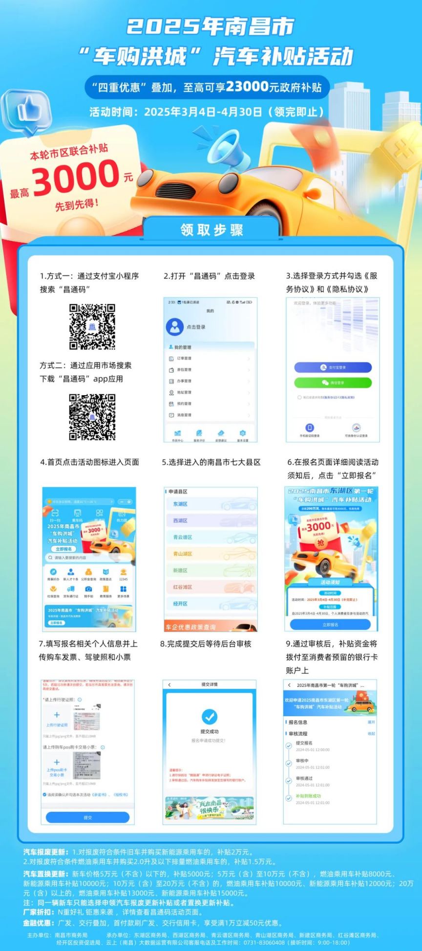 南昌市本级与东湖区、西湖区、青云谱区、青山湖区、新建区、红谷滩区、经开区联合我市160余家汽车经销企业(具体名单请在昌通码活动页面查询),重磅推出“车购洪城”汽车补贴活动。