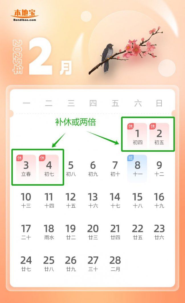 二、春节:1月28日(农历除夕、周二)至2月4日(农历正月初七、周二)放假调休,共8天。1月26日(周日)、2月8日(周六)上班。