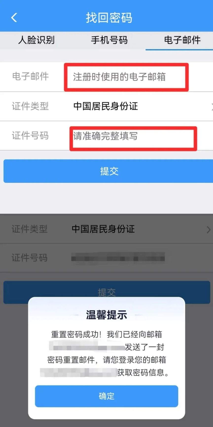 输入注册时使用的手机号码、证件号码等信息,填写新密码并获取验证码,点击提交即可启用新密码。