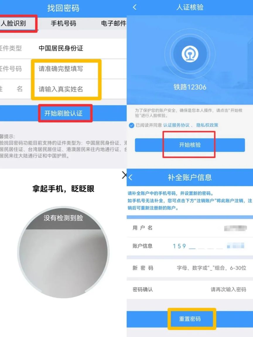 输入注册时填写的证件号码及姓名,点击开始刷脸认证;进入认证核验页面后勾选已阅读并同意认证服务协议、隐私权政策,点击开始核验;刷脸验证成功后,进入补全账户信息的页面,根据提示补充信息并设置新密码之后,点击重置密码。