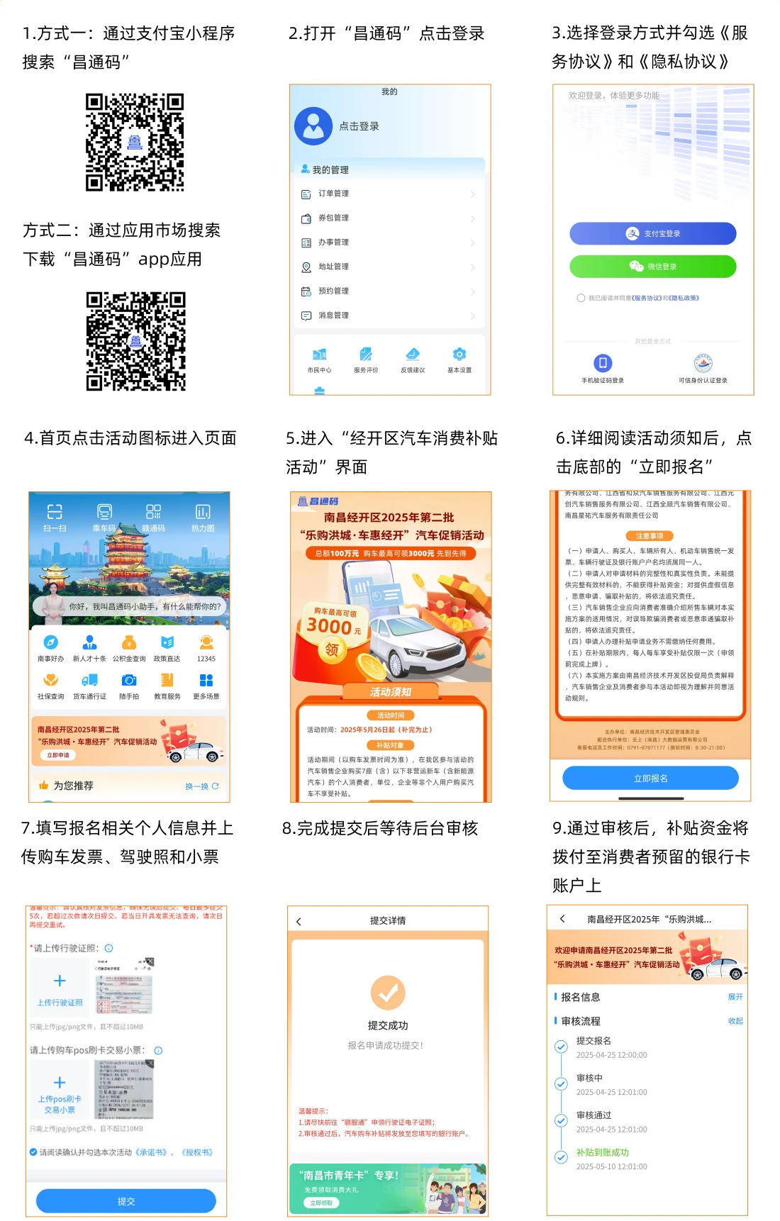 申领流程 1. "政策了解":首先,详细了解南昌经开区发布的2025年第二批汽车补贴政策,包括补贴金额、车型要求、申请条件等。 2. "准备材料":根据政策要求,准备以下材料: - 身份证明 - 车辆购置发票 - 车辆登记证书 - 车辆行驶证 - 其他可能需要的证明材料 3. "在线申请":通常,举报 -