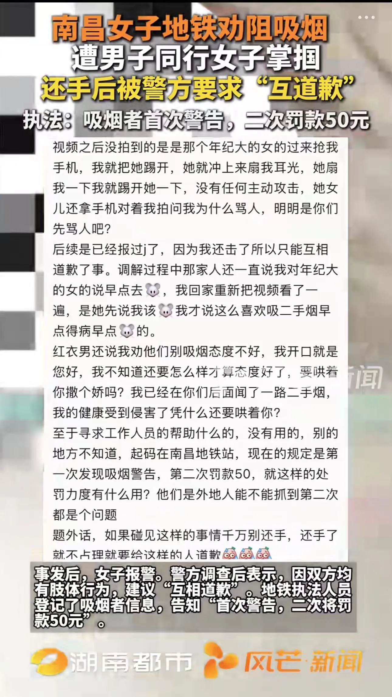 又和稀泥了?南昌,俩男子在地铁站内吸烟,女子上劝阻反遭掌掴!女子:“报案了,民警说我还手了,需互相道歉,对他们只是警告处罚!”网友:为什么猖狂的人越来越多 这就是原因!互殴再怎么重新定义,都没有结果!正当防卫界限一直不明不白!明明一眼看穿的事情,到了裁定的时候,就开始不清不楚了!