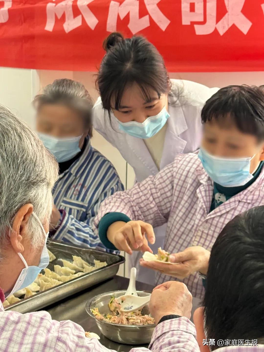活动当天,老年科病房内一片热闹景象。医护人员早已备好了饺子皮和多种新鲜美味的馅料,老人们洗净双手,便围坐在桌前,兴致勃勃地投入“创作”,还不时地拉起了家常。“看我这个,形状像不像个小元宝!”“这个包得好,我也来学学!”有的老人手法娴熟,放馅、沾水、捏褶一气呵成;有的虽动作稍缓,却格外认真,医护人员在旁搭手,帮着整理饺子形状。虽然省去了和面、擀皮的步骤,但老人们的专注和热情丝毫不减。不一会儿,一个个形态饱满的饺子便铺满了托盘上,活动室里笑语不断,空气中弥漫着的饺子香与温馨的氛围交织,俨然一副家庭团聚的热闹景象。“大家一块包饺子,就像过年一样!”张奶奶捧着刚包好的饺子,脸上满是笑意,“这里的医护人员真贴心,这个节过得真开心!”